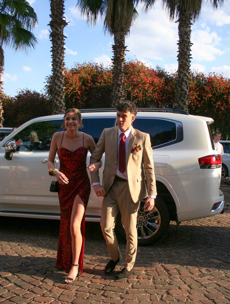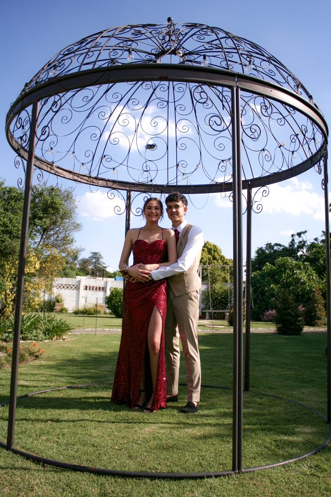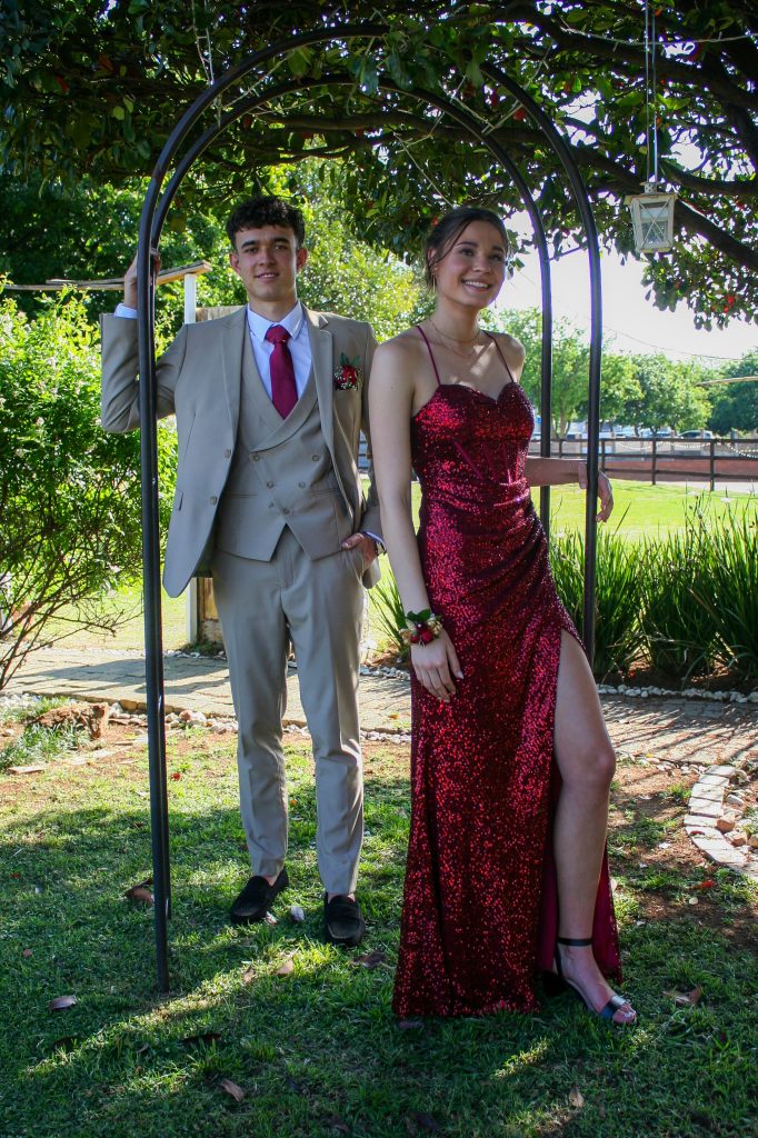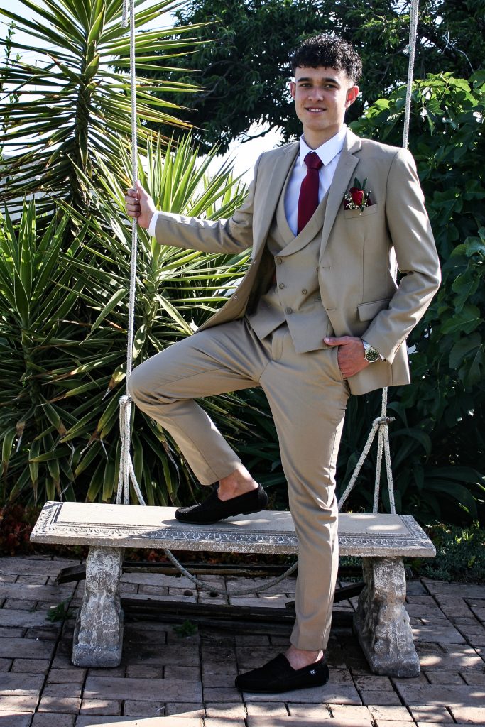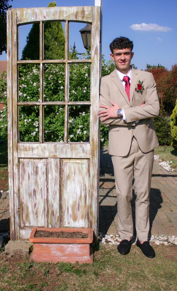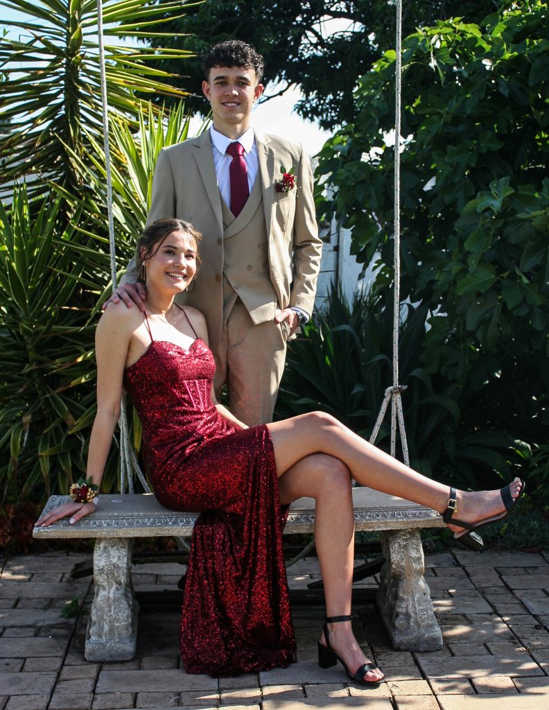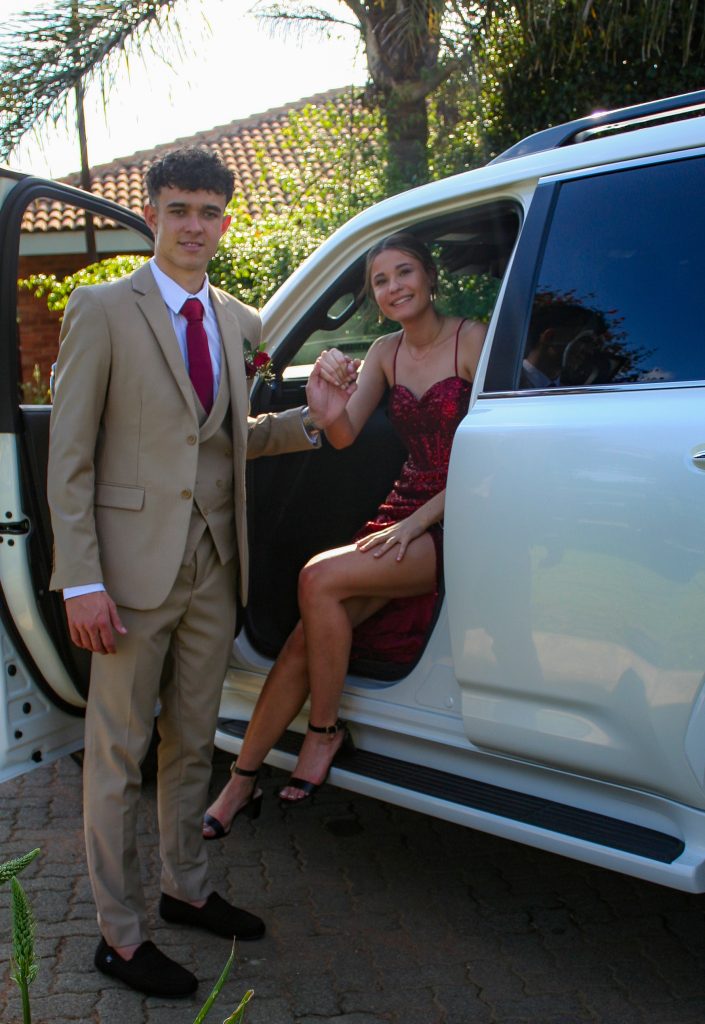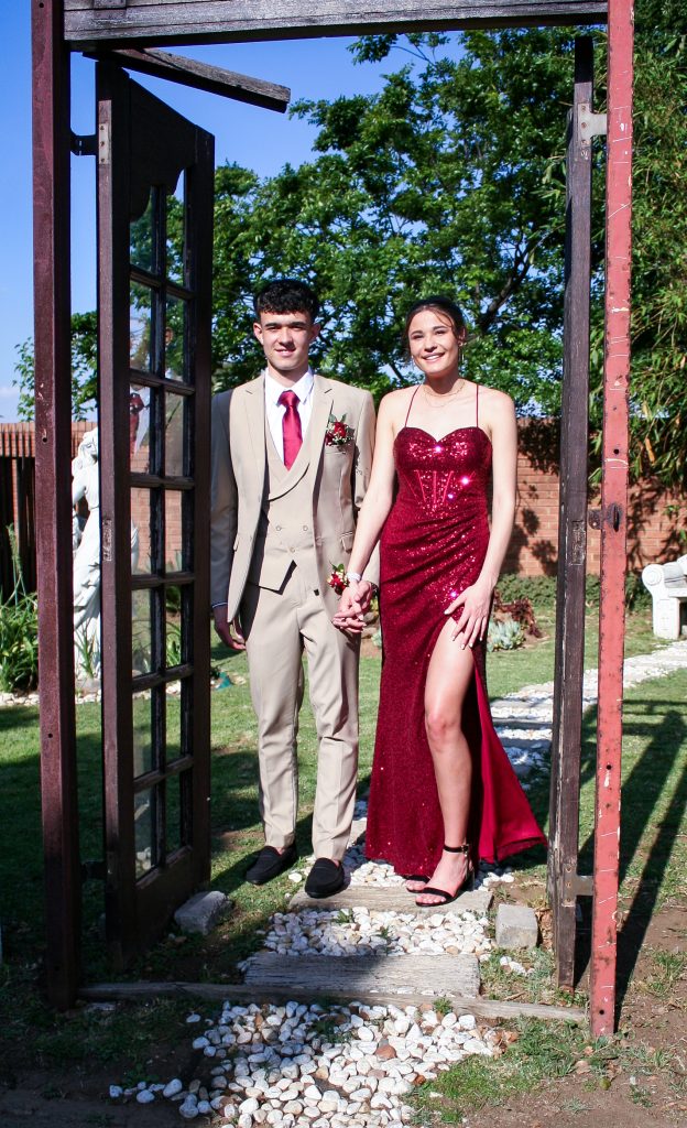 Dylan and Iné from Brandwag High School looked effortlessly elegant for their Matric Farewell. Dylan wore a beige sand suit paired with a crisp white shirt, a bold red tie, and sleek black loafers — a look that was simple, sharp, and full of meaning. The red tie, chosen to match his girlfriend’s dress, tied their looks together beautifully, adding a touch of sentiment to the night.