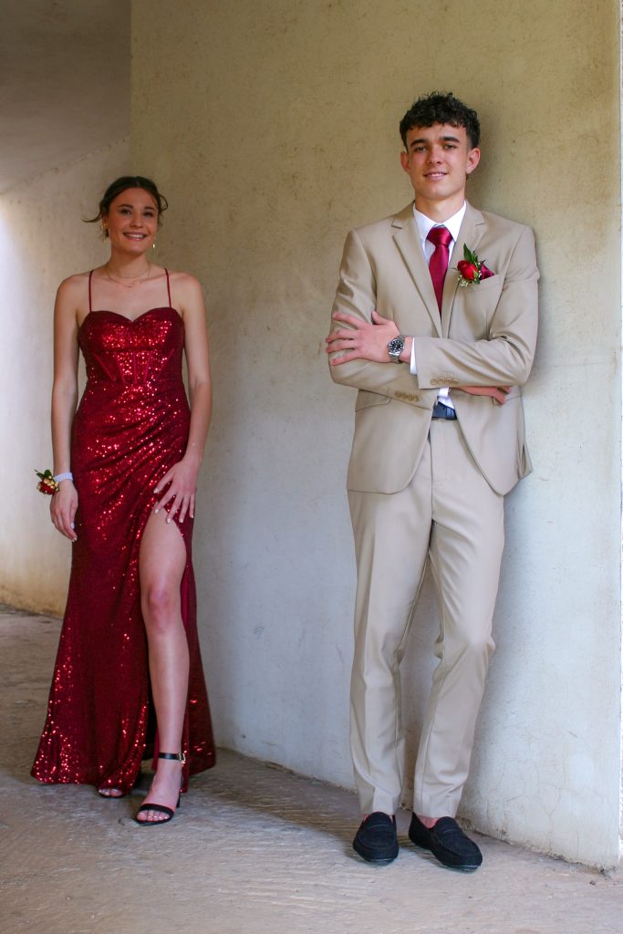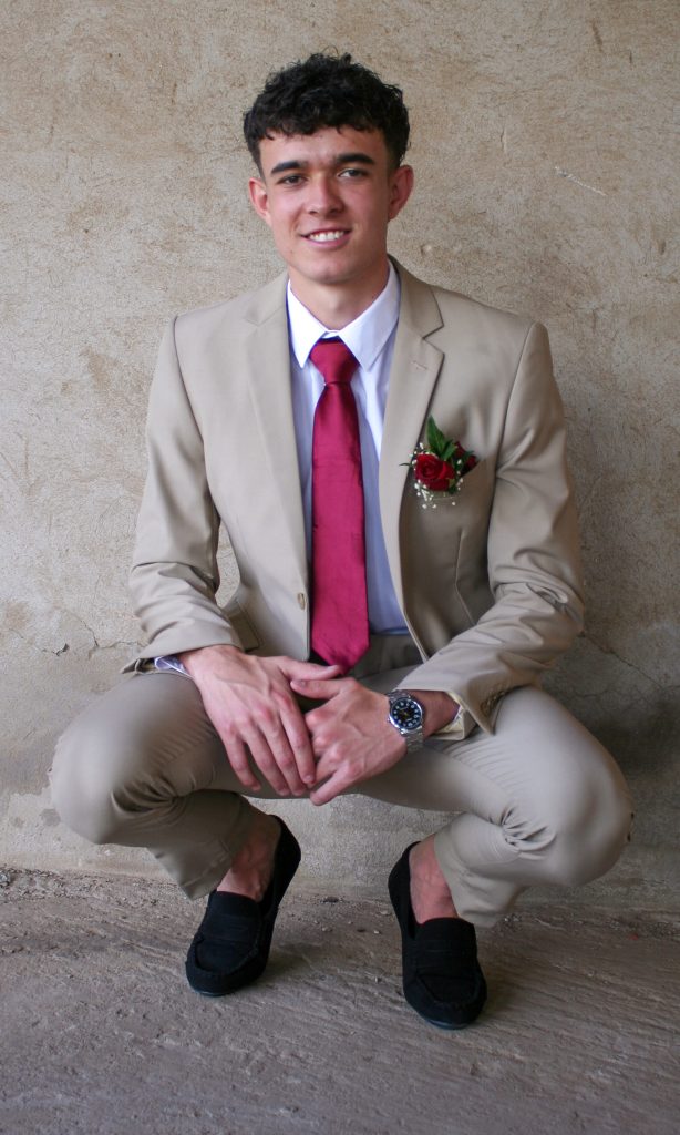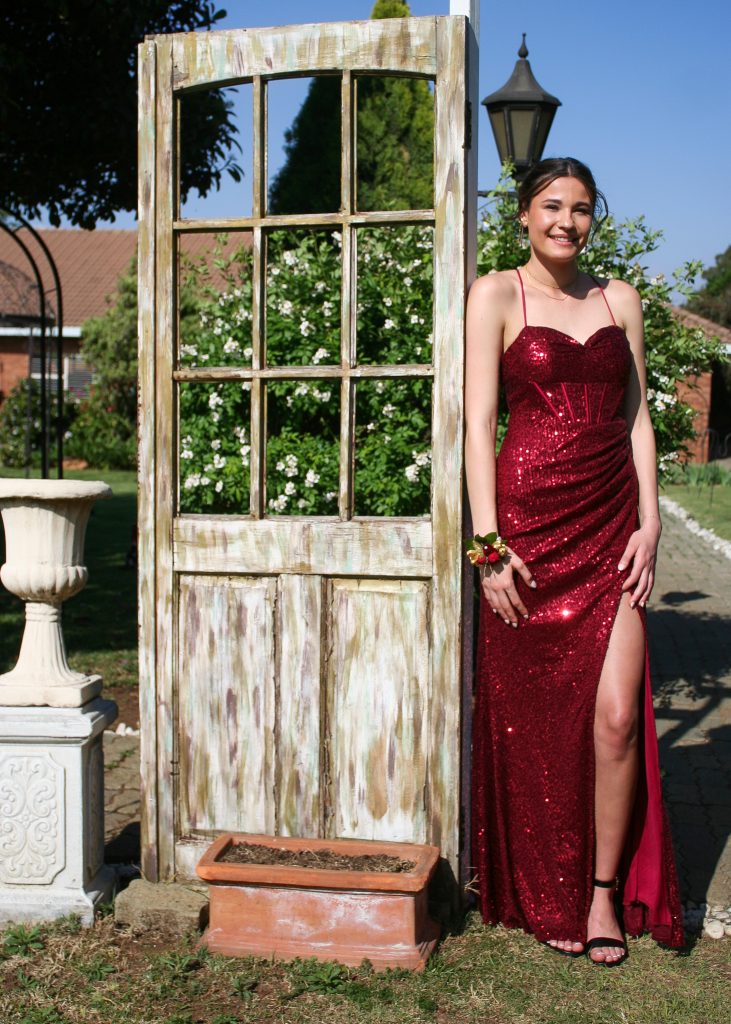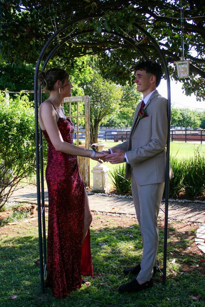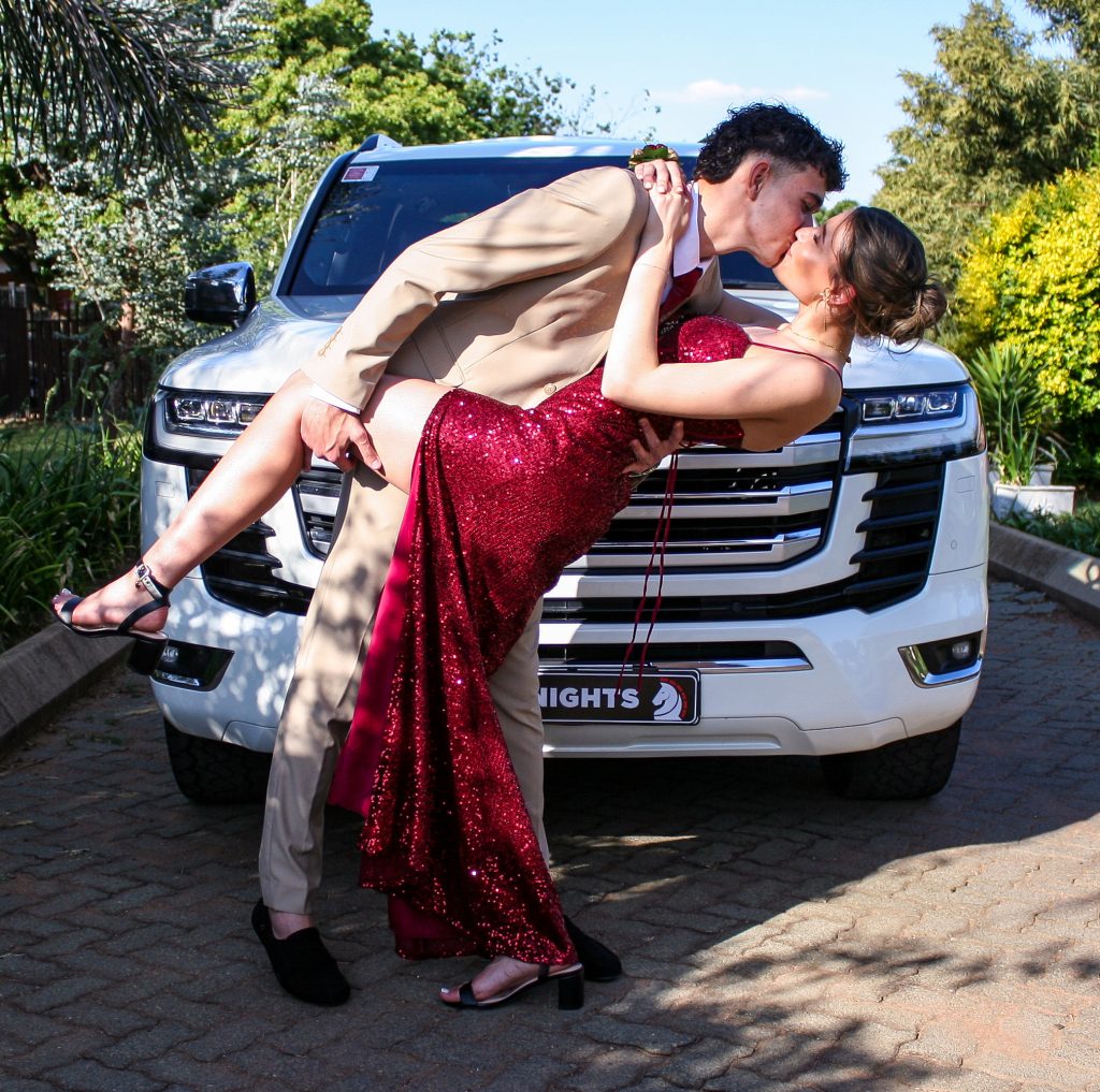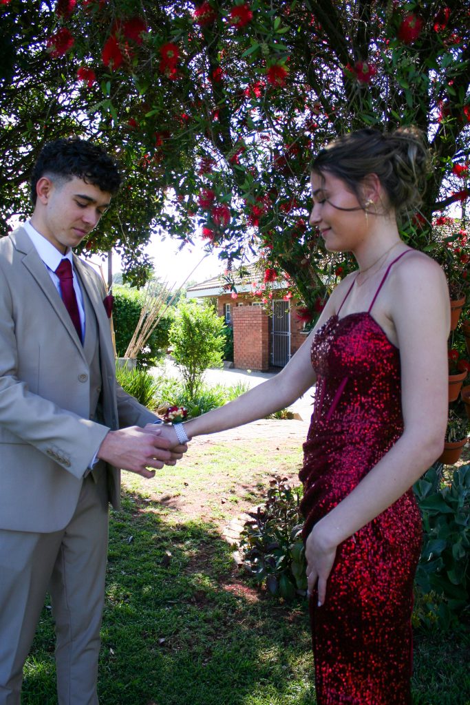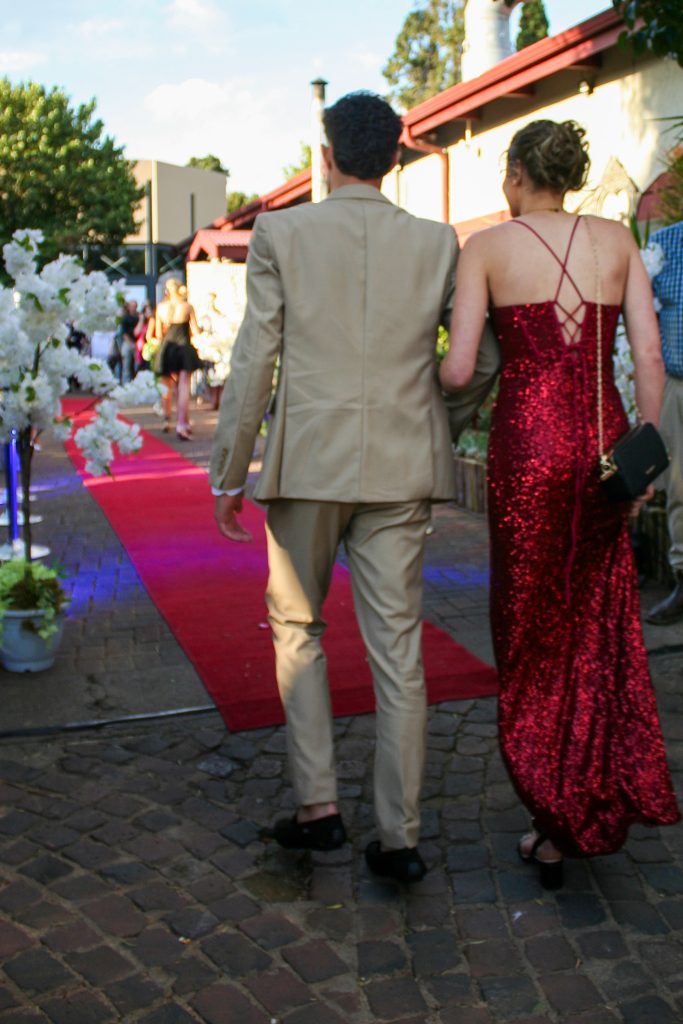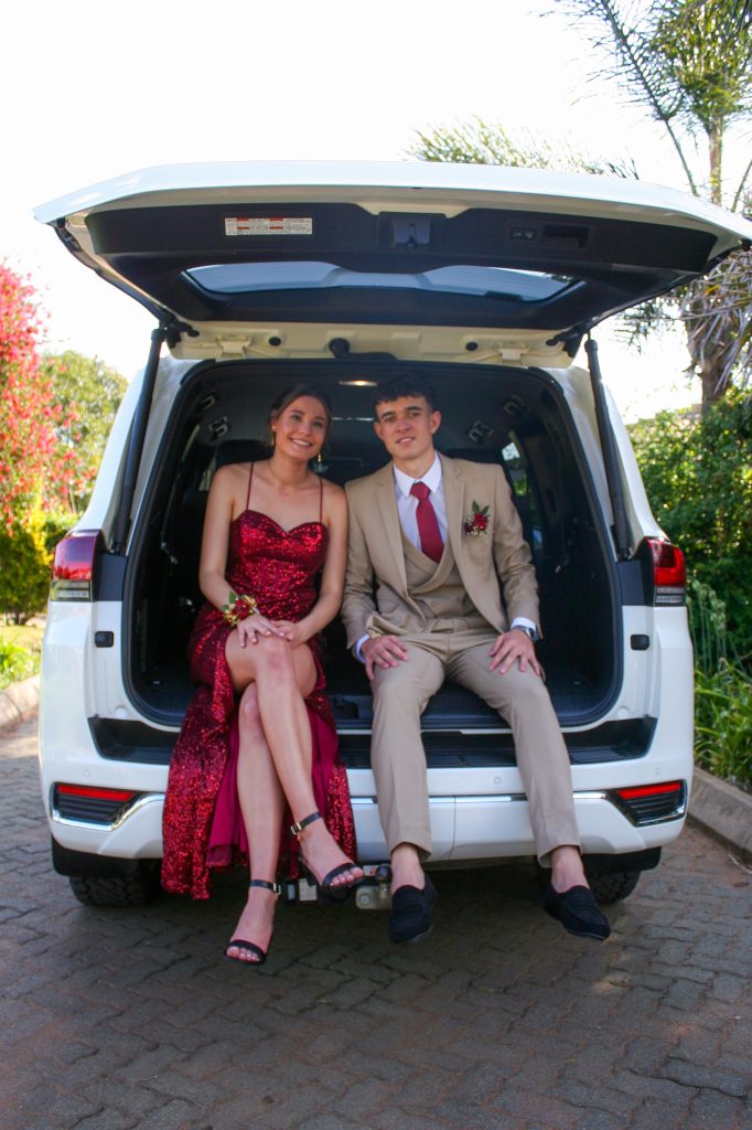 Dylan and Iné from Brandwag High School looked effortlessly elegant for their Matric Farewell. Dylan wore a beige sand suit paired with a crisp white shirt, a bold red tie, and sleek black loafers — a look that was simple, sharp, and full of meaning. The red tie, chosen to match his girlfriend’s dress, tied their looks together beautifully, adding a touch of sentiment to the night.