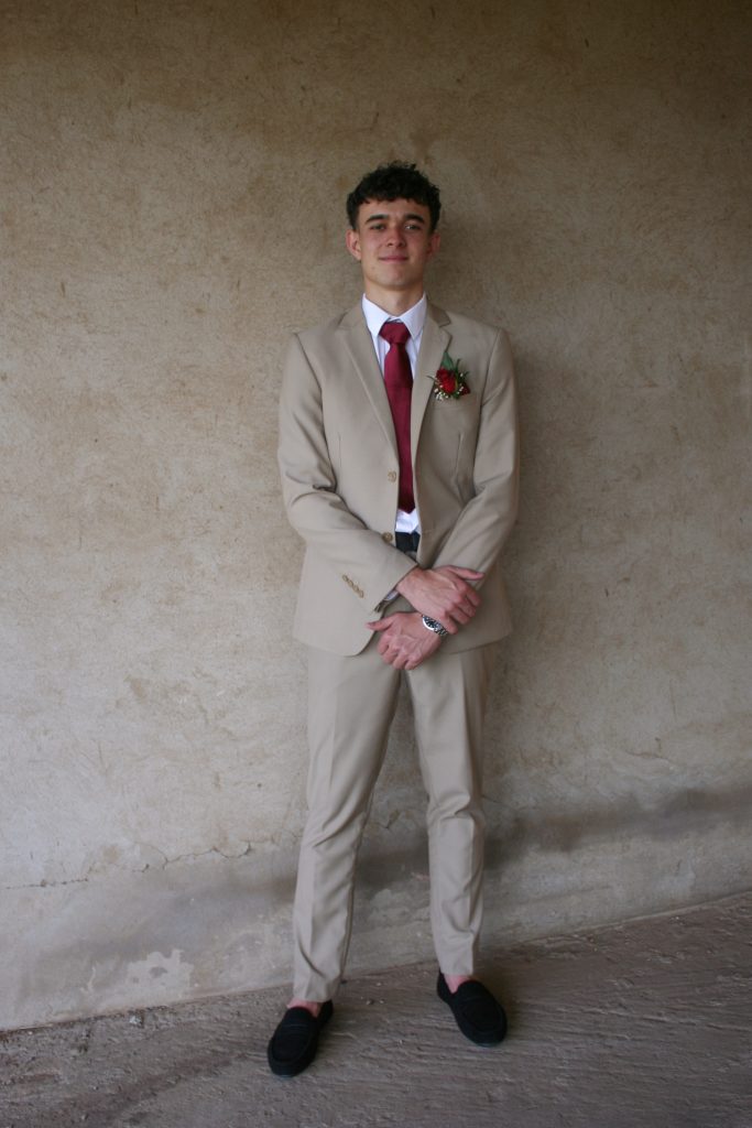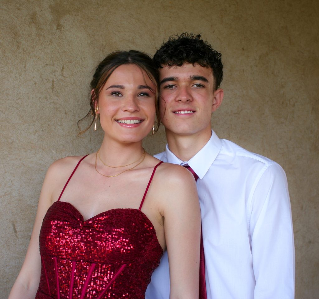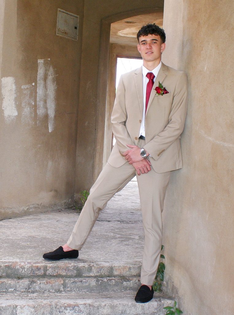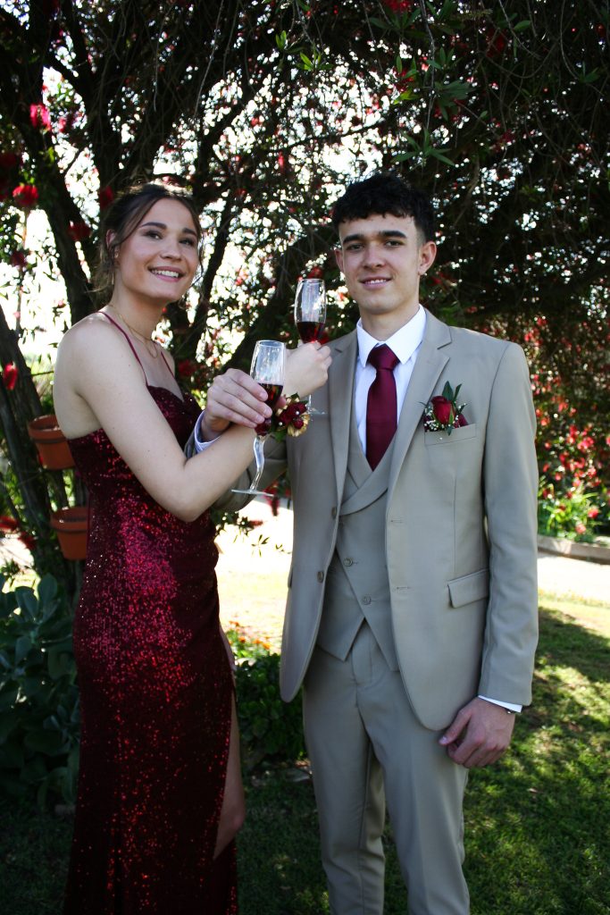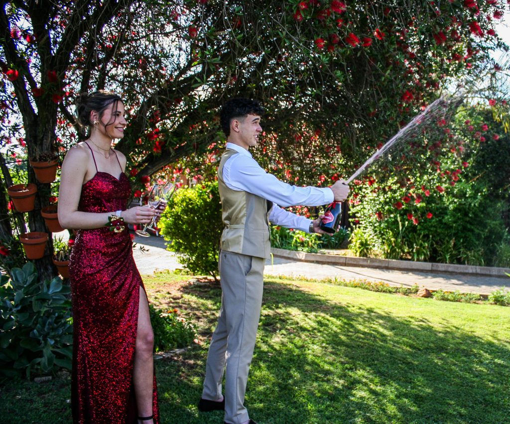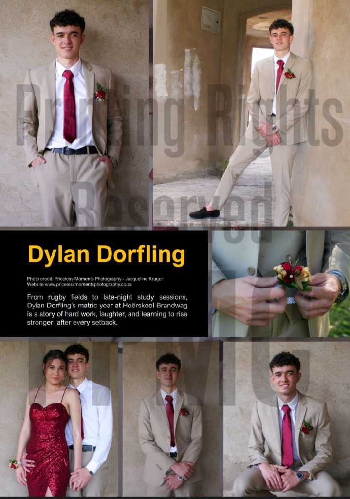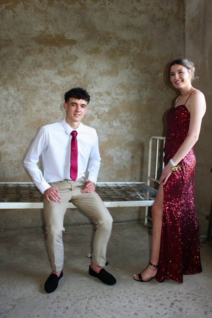 Dylan and Iné from Brandwag High School looked effortlessly elegant for their Matric Farewell. Dylan wore a beige sand suit paired with a crisp white shirt, a bold red tie, and sleek black loafers — a look that was simple, sharp, and full of meaning. The red tie, chosen to match his girlfriend’s dress, tied their looks together beautifully, adding a touch of sentiment to the night.